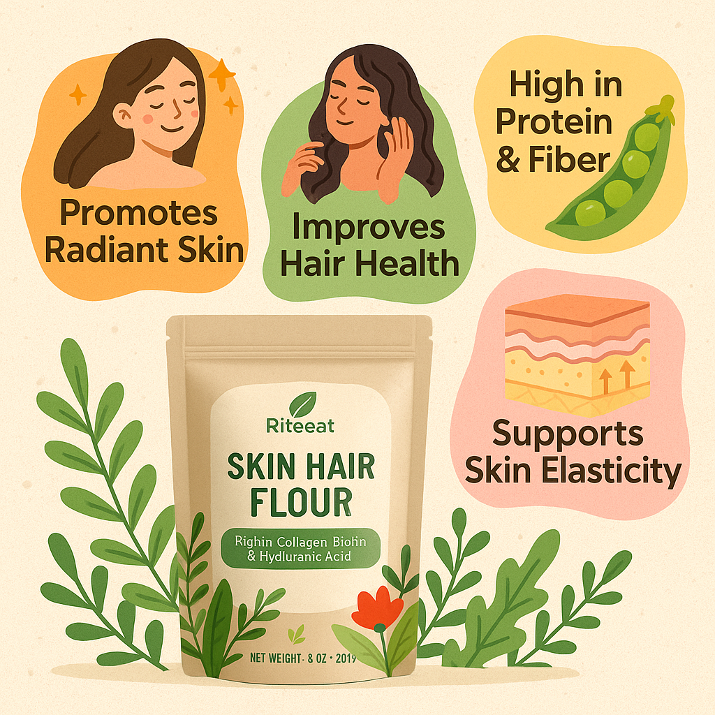 RiteEat Skin & Hair Flour is thoughtfully crafted with a nutrient-rich combination of millets and grains to support skin elasticity, hair strength, and overall radiance. With every spoonful, you’re getting the power of natural antioxidants, biotin precursors, protein, and essential minerals.Key Benefits